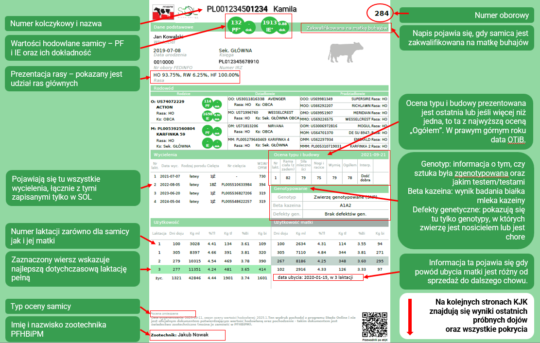 Część z państwa zetknęła się zapewne z elektroniczną Kartą Jałówki-Krowy, którą można wygenerować w programie SOL. Czym się różnią te dwie karty i dlaczego mogą między nimi występować różnice? Karta pobierana z PFHB24 jest „oficjalna”. Oznacza to, że wszystkie prezentowane w niej dane są zatwierdzone w naszym głównym systemie informatycznym Fedinfo – od wycieleń, przez wyniki badań genetycznych aż po pokrycia inseminacyjne. Karta pobierana z SOLa różni się od tej PFHB24 kolorem (jest zielona), ale zawiera także informacje zapisane do tej pory tylko w SOL, które jeszcze nie trafiły do Fedinfo. Dobrym przykładem są tutaj inseminacje oraz wycielenia o statusie WLA. Warto pamiętać, że obydwie karty „elektroniczne” jak i drukowana KJK dotychczas dostarczane hodowcom, nie są oficjalnymi dokumentami potwierdzającym wartość hodowlaną oraz pochodzenie. Takim dokumentem jest świadectwo zootechniczne (można je zamówić w PFHBiPM).