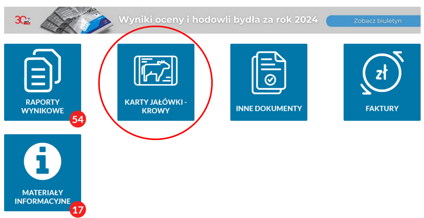 Po zalogowaniu się do PFHB24, na pulpicie obok czterech kafelków, które już tam są od dłuższego czasu, pojawi się również dodatkowy piąty kafelek o nazwie „Karty Jałówki-Krowy”.