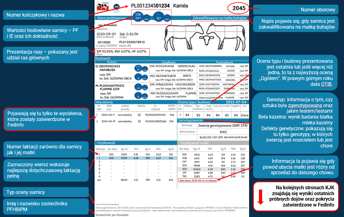 W sekcji Dane podstawowe, obok wartości hodowlanych, pojawią się ich dokładności. Poniżej, znajdzie się prezentacja rasy z udziałem procentowym poszczególnych ras oraz księga, do której przynależy samica. Zmianie nie ulegnie grafika przedstawiająca krowę – pozostaje ona w starym stylu, jednakże w przyszłości zastąpią ją zdjęcia. Ponad konturami, z prawej strony na granatowej belce, jeśli samica spełniła warunki, pojawi się informacja o tym, że została ona zakwalifikowana na matkę buhajów.
