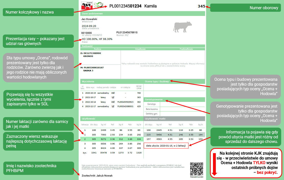 Ryc.2 eKJK wersja PFHB24 dla umowy Ocena + Hodowla (O+H) – czerwoną ramką otoczone są informacje, które odróżniają KJK od tej z SOLa.