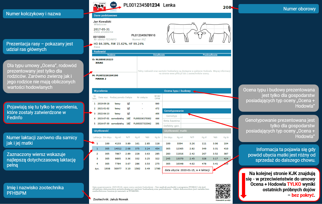 Nowości pojawią się także w stopce KJK. O ile przypis z gwiazdką informujący o typie oceny oraz informacja o dacie wygenerowania KJK i sezonie oceny są czymś znanym już użytkownikom, tak w stopce KJK pojawi coś czego jeszcze nie było. Mianowicie jest to imię i nazwisko zootechnika oceny obsługującego daną oborę oraz kod QR, który przeniesie użytkownika do strony z „poradnikiem eKJK”. Co to za poradnik? Już tłumaczę. Pomiędzy kartami, w zależności od programu, z którego są pobierane oraz typu umowy na Ocenę Wartości Użytkowej Bydła zawartej z PFHBiPM, występują różnice w prezentacji danych. To właśnie te różnice będą wyłuszczone w tej instrukcji.